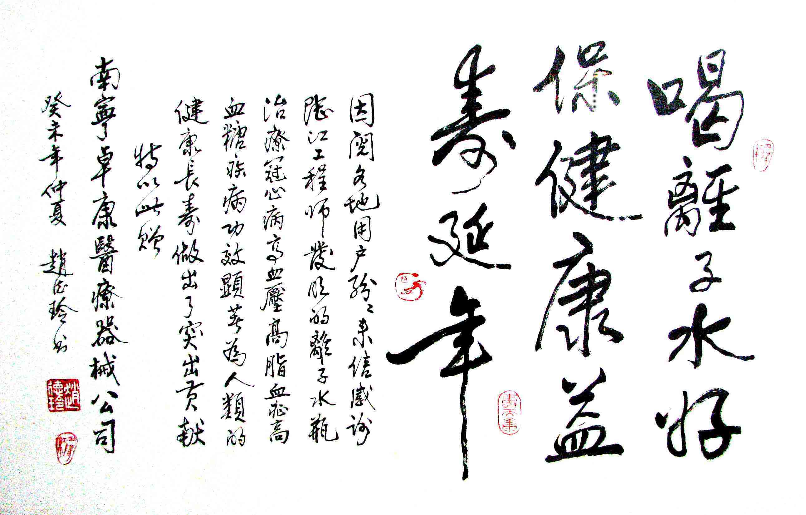 - -- 幾千年來,人類靠醫(yī)藥不能根治冠心病、高血壓和糖尿病,如想根治,那是夢想。可是,我從中國基礎醫(yī)學研究成果受到啟發(fā),研發(fā)了一種發(fā)明產(chǎn)品,處理出微小分子團水讓人飲用,實現(xiàn)了人類這一夢想!患者飲用后遠離了冠心病、高血壓和2型糖尿病。這一成果曾經(jīng)過臨床試用和專家鑒定,作為準字號醫(yī)療器械讓廣大患者飲用,療效進行跟蹤調(diào)查。很多患者的反饋情況令人感動,我放在公司網(wǎng)站上(nnzk.com),震撼了醫(yī)學專家,也使廣大同胞受到啟發(fā)。人們盼望飲用它給細胞補水,治愈多種病癥,既省錢,又安全,而且延長壽命。