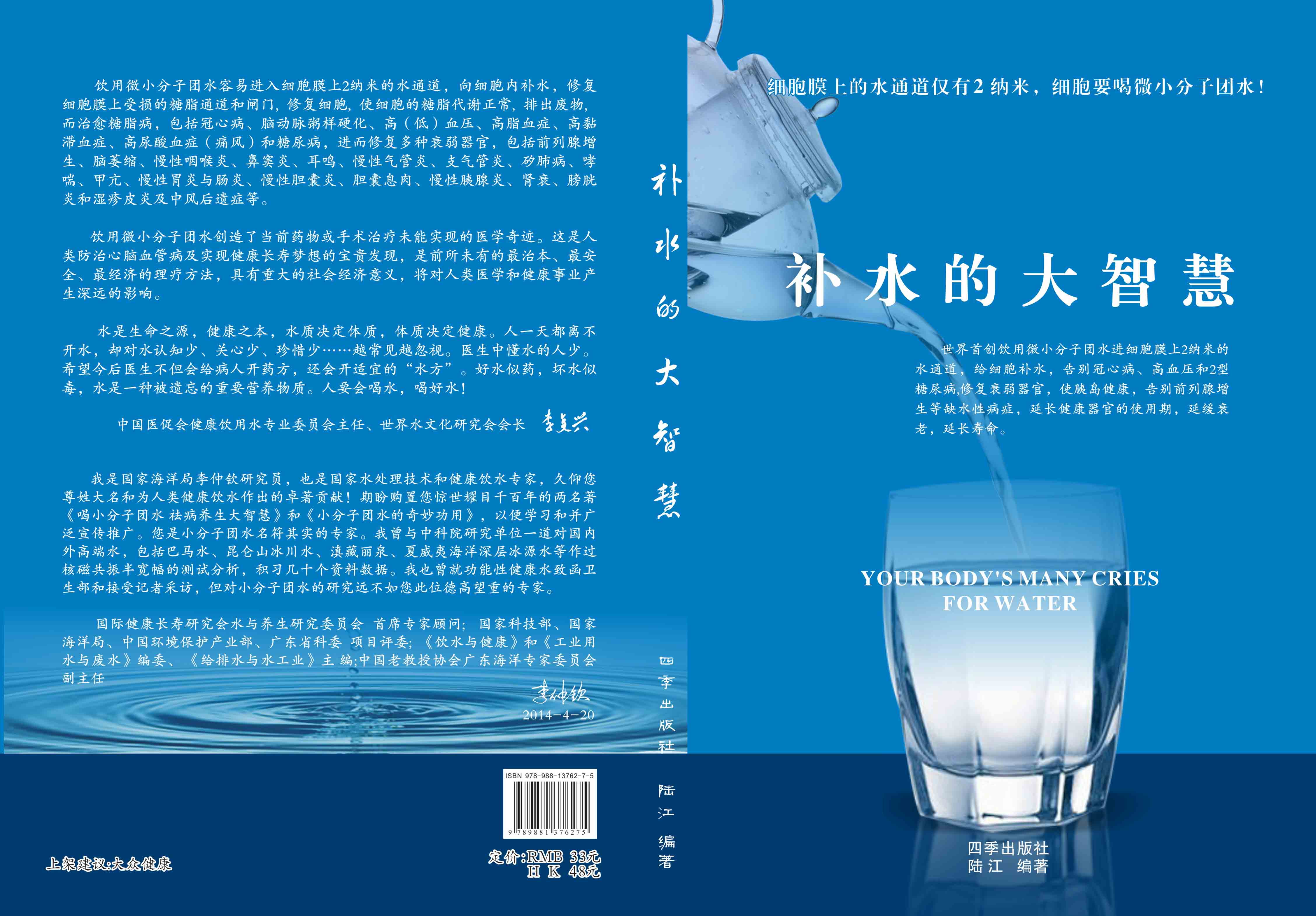 ----幾千年來,人們感到口渴才喝水,誤認為口渴是唯一的缺水信號,使喝水量偏少。很多人只知道補血補氣補腎補鈣補硒,而不知補水,逐漸使許多器官缺水,包括皮膚、動脈、氣管、膽囊、腸胃、骨關節(jié)、腎臟、前列腺和胰島缺水,以致患冠心病、高(低)血壓和糖尿病等缺水性病癥。美國F·巴特曼醫(yī)學博士寫有《水是最好的藥》一書很受歡迎,我國2007年譯成中文版,論述人體缺水引起許多病癥,他指導3000多患者喝水治愈了哮喘、胃炎和高血壓等病癥。而我是從2000年起,讓患者飲用微小分子團水,因為容易進細胞膜上2納米的水通道,治愈了許多缺水性的病。我跟蹤調(diào)查14年,發(fā)現(xiàn)凡是認真飲用和合理膳食,可治愈冠心病、高(低)血壓和2型糖尿病與衰弱器官并發(fā)癥及中風后遺癥。高血壓患者飲用2~5個月,癥狀消除,不再服藥,逐漸逆轉至消除動脈粥樣硬化,血壓正常穩(wěn)定,治愈了高血壓;冠心病人飲用3~5個月,消除心絞痛、房顫等癥狀,不再服藥,一年左右心電圖正常,經(jīng)冠狀動脈造影掃描表明冠脈內(nèi)無粥樣斑塊,真正治愈了冠心病;2型糖尿病人飲用3~10個月停藥,血糖尿糖正常,糖尿病痊愈。并且使前列腺增生、慢性咽喉炎、鼻竇炎、耳鳴、慢性氣管炎、支氣管炎、哮喘、矽肺病、慢性胃腸炎、膽囊炎、胰腺炎、腎衰、膀胱炎、風濕性關節(jié)炎、便秘、痔瘡和濕疹皮炎等不藥而愈,而無需終生服藥。飲用微小分子團水治愈的是長期吃藥治不好的病,彌補了幾千年來醫(yī)藥的欠缺,成為人類健康的寶貴資源。