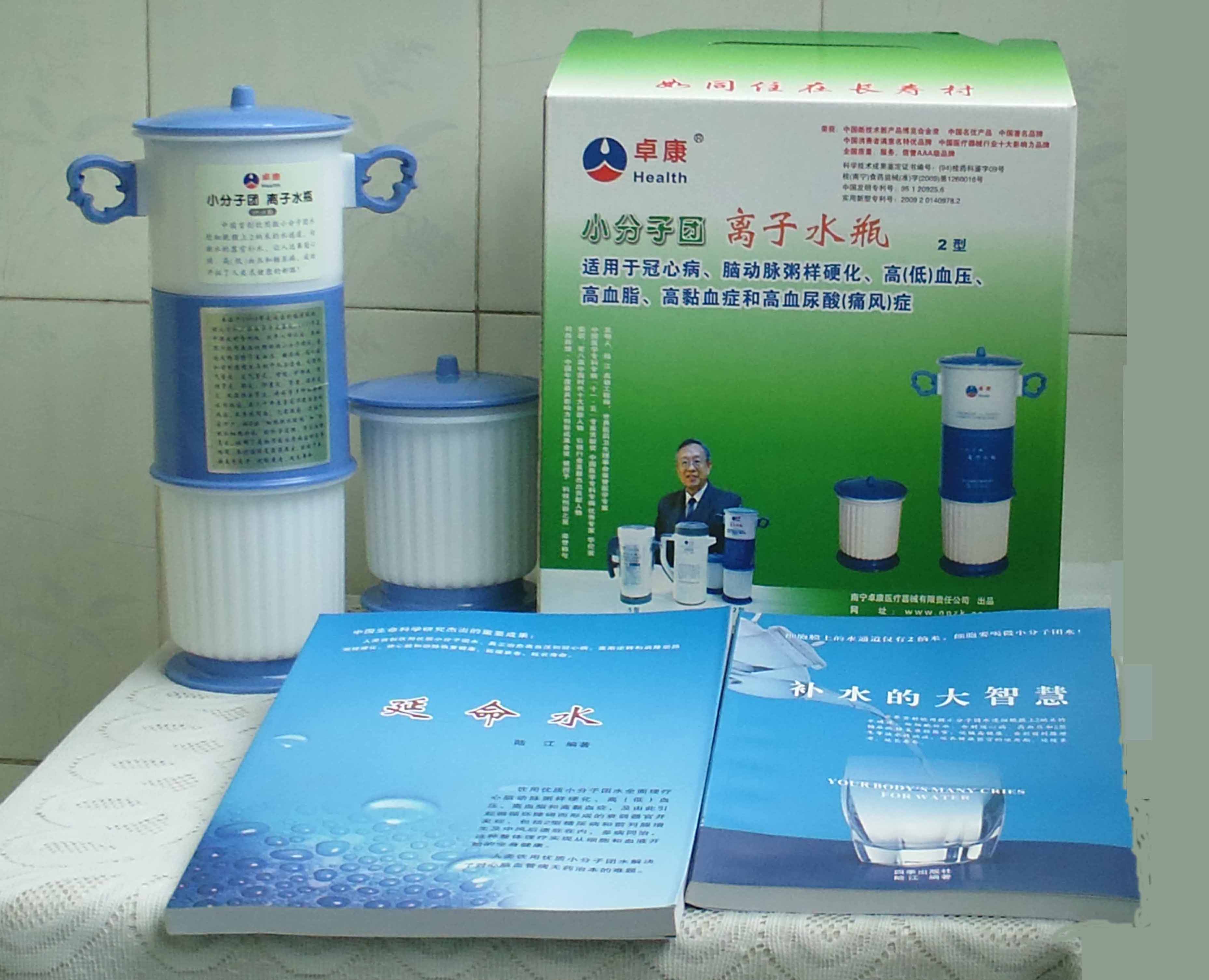 本品大量用戶的使用效果表明,能治愈冠心病、腦動脈硬化、原發(fā)性高(低)血壓、高血脂、高粘血癥、高血尿酸癥(痛風)和2型糖尿病、衰弱器官并發(fā)癥(前列腺增生、腎衰與尿毒癥)及中風后遺癥等療效好。產(chǎn)品配信譽卡。使用壽命30年,不換芯,易清洗。團購優(yōu)惠。從郵局匯款,匯費1%,地址按本頁下方地址、聯(lián)系人寫。從銀行匯款,請點擊[聯(lián)系匯款]欄,從工商銀行匯款,建設銀行、農(nóng)業(yè)銀行匯款,均免收匯費,匯款后20--30分鐘內(nèi)發(fā)短信,可用微信轉帳,均免匯費,微信號即手機號13768308380。匯款后,告知你的姓名和地址,我公司聯(lián)系人手機號是:13768308380。卓康牌離子水瓶為我公司獨家生產(chǎn),郵購產(chǎn)品配《補水的大智慧》彩印書一本,另配四季出版社出版的新書《補水的大智慧》一本,并配光盤一張(含央視主持人釆訪陸江的對話視頻)。目前市場和"淘寶網(wǎng)"上有人兜售假冒的偽品,望讀者審察辯別真?zhèn)危旒僬哓飧`假冒本公司的各種認證、獲獎獎項、專利號和外包裝盒上的中英文字,包括科技成果的鑒定意見等,請讀者注意防偽。如何識別假貨?已經(jīng)買了假貨怎么辦?(請點擊[打假掠影][打假掠影])。