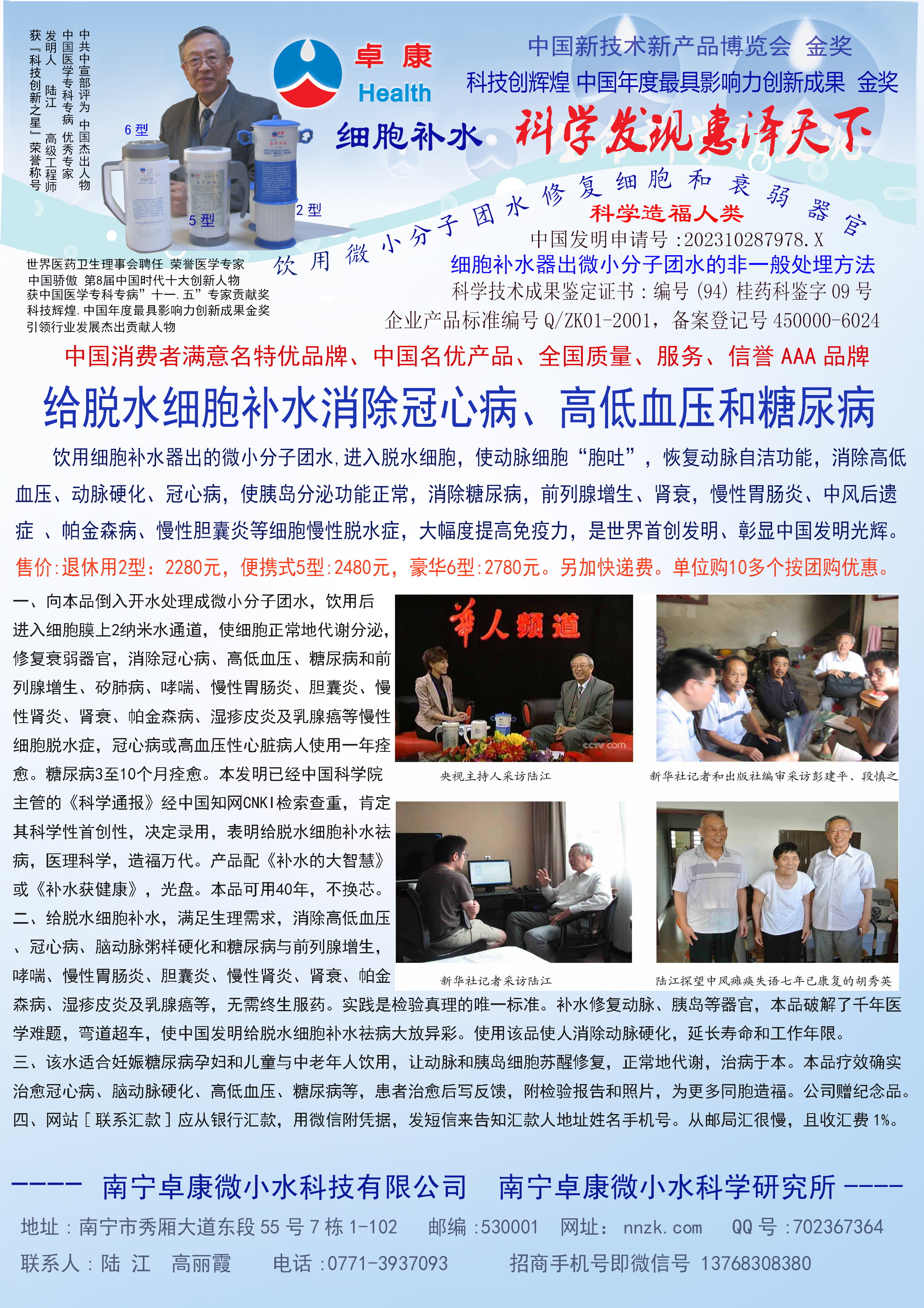 人類幾千年來患以上病癥需終生服藥,幾十年也不能治愈。可是我國南寧的高級工程師陸 江,于1990年想根治高血壓,研究發(fā)明了離子水瓶,處理出微小分子團水供飲用,經(jīng)過醫(yī)院臨床試用和專家鑒定,1999年獲中國發(fā)明專利權,產(chǎn)品于2000年投放市場后一直跟蹤調(diào)查,據(jù)全國各地用戶反饋:祛除了高低血壓、糖尿病和冠心病,并使前列腺增生、咽喉炎、鼻竇炎、慢性氣管炎、支氣管炎、矽肺病、哮喘、慢性胃炎、腸炎、慢性膽囊炎、慢性腎炎、腎衰、膀胱炎、便秘、痔瘡、風濕性關節(jié)炎和濕疹皮炎及中風后遺癥等病癥不藥而愈。為什么喝微小水能治20多種病?陸 江從1991年德國科學家發(fā)現(xiàn)細胞膜水通道僅為2納米獲得啟發(fā),認為多種器官患病是因細胞脫水,不能正常代謝和分裂增殖,才使器官細胞減少致衰弱萎縮而形成細胞缺水性病癥。22年來的實踐有力地支持了“細胞脫水致病”這一重要論點,表明喝微小水可滿足細胞的生理需求,補水就能祛病,是生命科學新亮點。